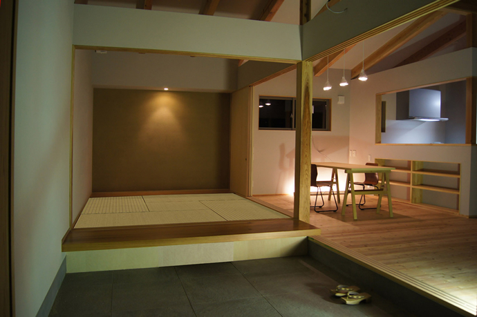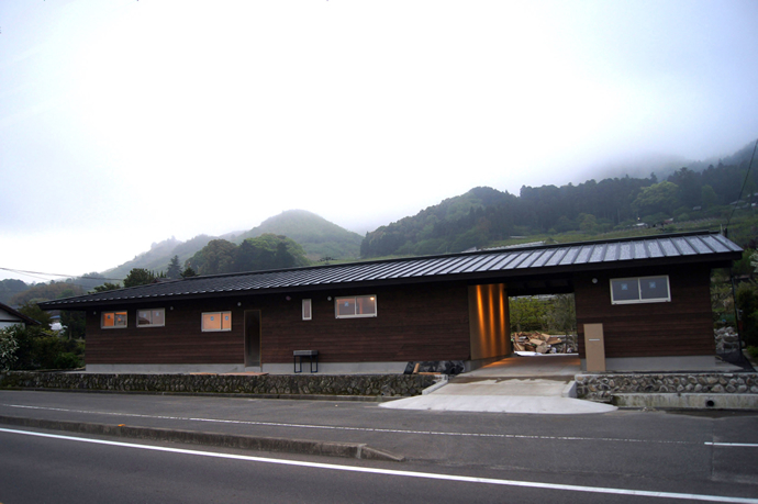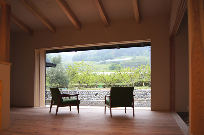 福岡県うきは市浮羽町流川に住宅の設計・監理のお仕事をさせて頂きました。計画地は耳納連山のふもとにあり、山の季節を生活に取り込めたらと思い設計に取組みました。計画していくうちに出た答えが、リビングに大きな開口部を設け、夏には、美しい緑色の葉を付けた柿の木を、秋は黄金に輝くイチョウの木を、冬は山に降る白い雪を、春は淡いピンク色の桜の花を楽しむ事が出来ます。
